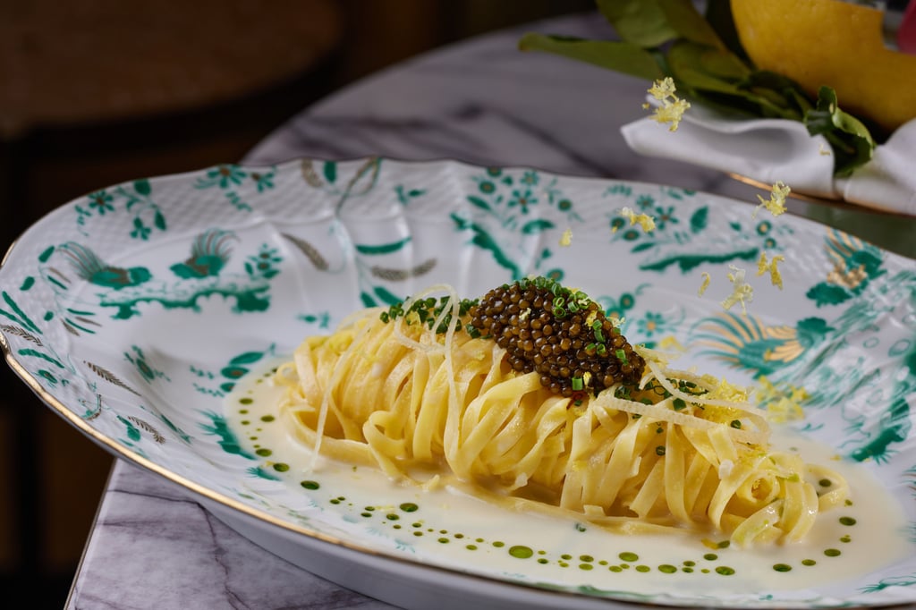 香港Qura酒吧内搭配普鲁尼尔奥西特拉鱼子酱的意大利细面。图片来源:Qura酒吧