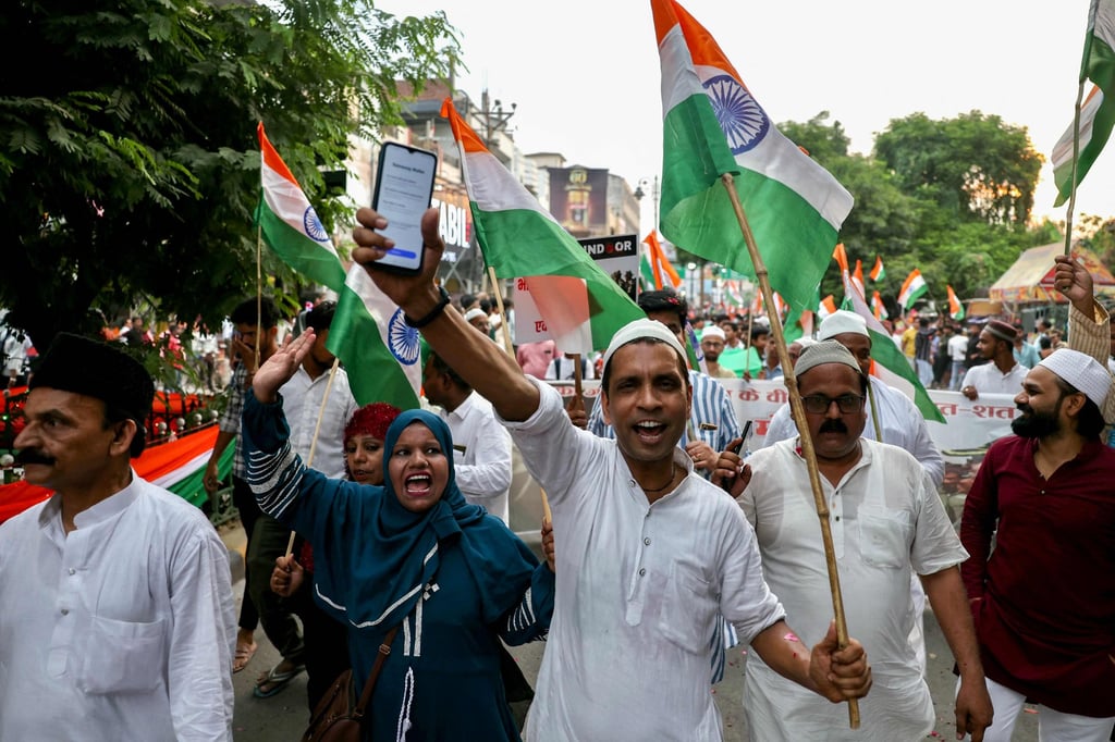 5月24日,印巴同意停火后,民众手持印度国旗参加集会表达对武装部队的支持。图片来源:法新社