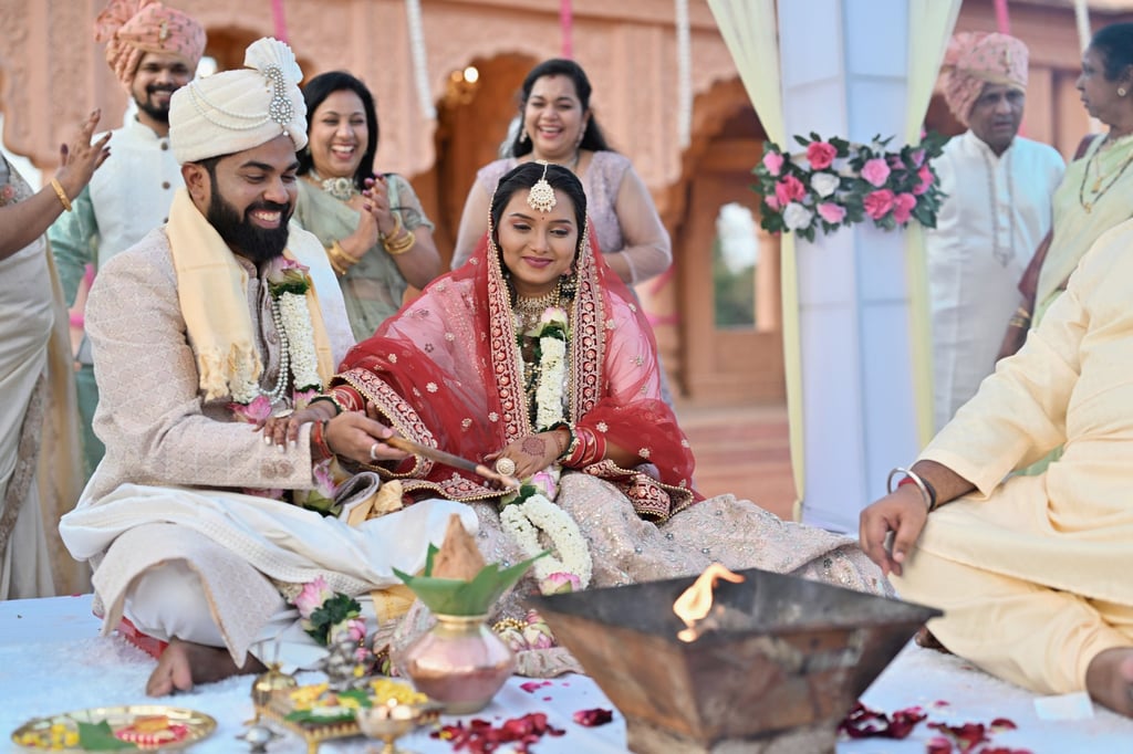 当天清晨的仪式由印度教祭司主持,随后进行姜黄膏祈福和汉娜手绘环节,现场还准备了丰盛的美食。
