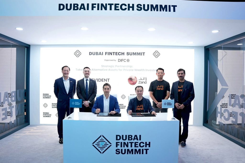 (从左至右)香港投资推广署金融服务、金融科技及可持续发展全球主管梁瀚璟;香港数码港金融科技主管严跃明;Evident集团创始人兼首席执行官施福来;Zand银行财富与资产管理主管霍朗廷;Zand银行首席执行官陈志宏及首席运营官帕拉格·古普塔。图片来源:供图