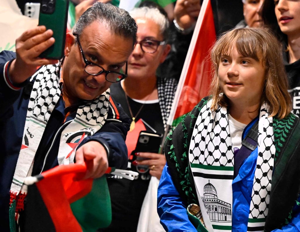 瑞典活动家格蕾塔·通贝里(右)在"马德琳号"被捕遭驱逐后,于周二抵达斯德哥尔摩时受到迎接。照片:法新社
