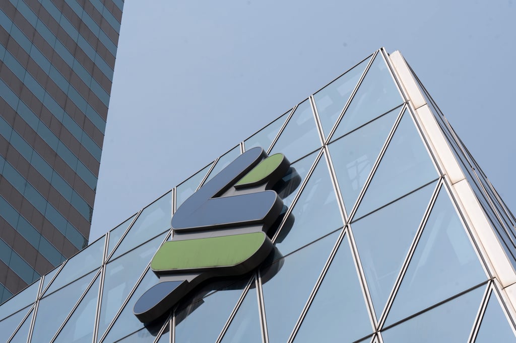 渣打银行标志悬挂于其中环某财富管理中心顶部。照片:Nathan Tsui