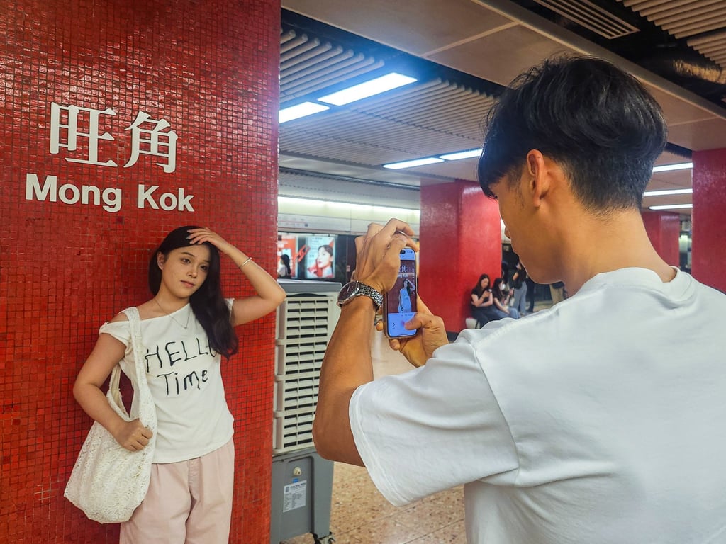 一名内地游客在旺角地铁站标识旁留影,该站与尖沙咀站尤其受跨境游客青睐。图片来源:Timon Johnson