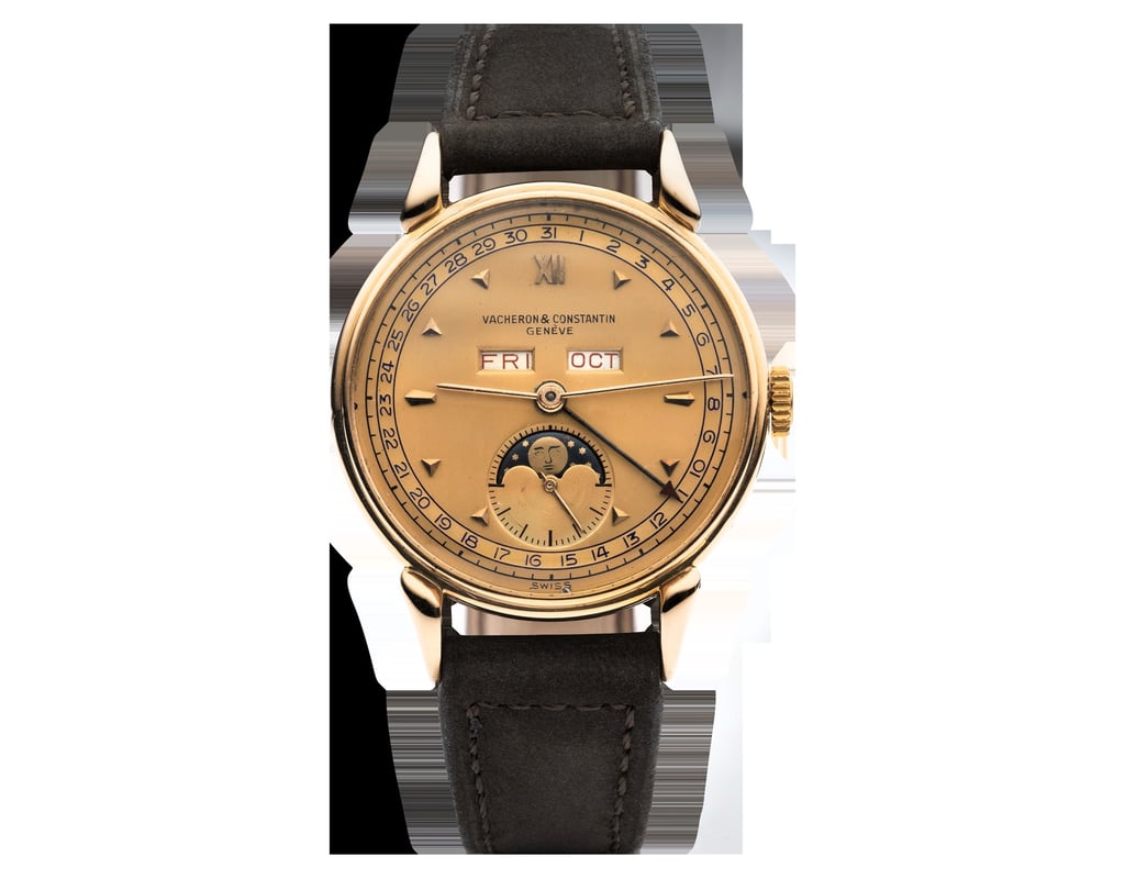 江诗丹顿传承系列1946年私人收藏腕表,采用18K玫瑰金表壳,配备完整日历与月相复杂功能,搭载12又1/2法分495机芯。图片:资料提供