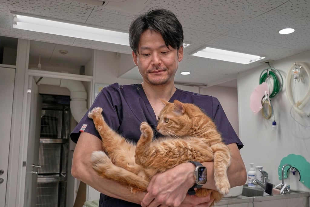 东京某诊所内,一名兽医正怀抱日本短尾猫。美联社照片显示,从业者正接受培训以识别染疫动物特征并采取防蜱措施。