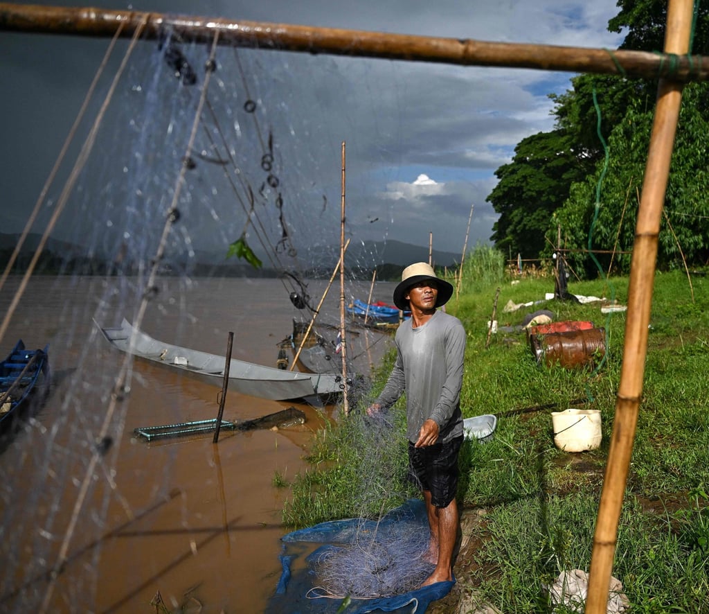 泰国渔民萨瓦·考达姆在清莱府金三角地区的湄公河畔整理渔网。图片来源:法新社