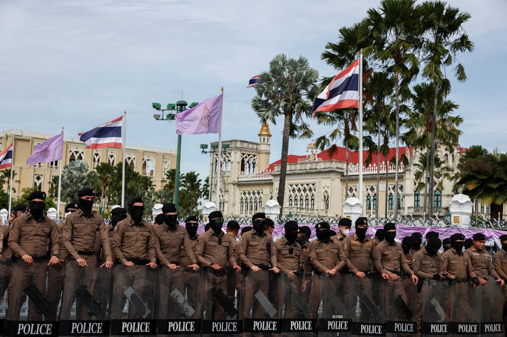 周四,在泰国总理佩通坦·西那瓦与柬埔寨洪森通话内容泄露后,曼谷政府大楼前,警察在反政府抗议活动前站岗守卫。照片:路透社