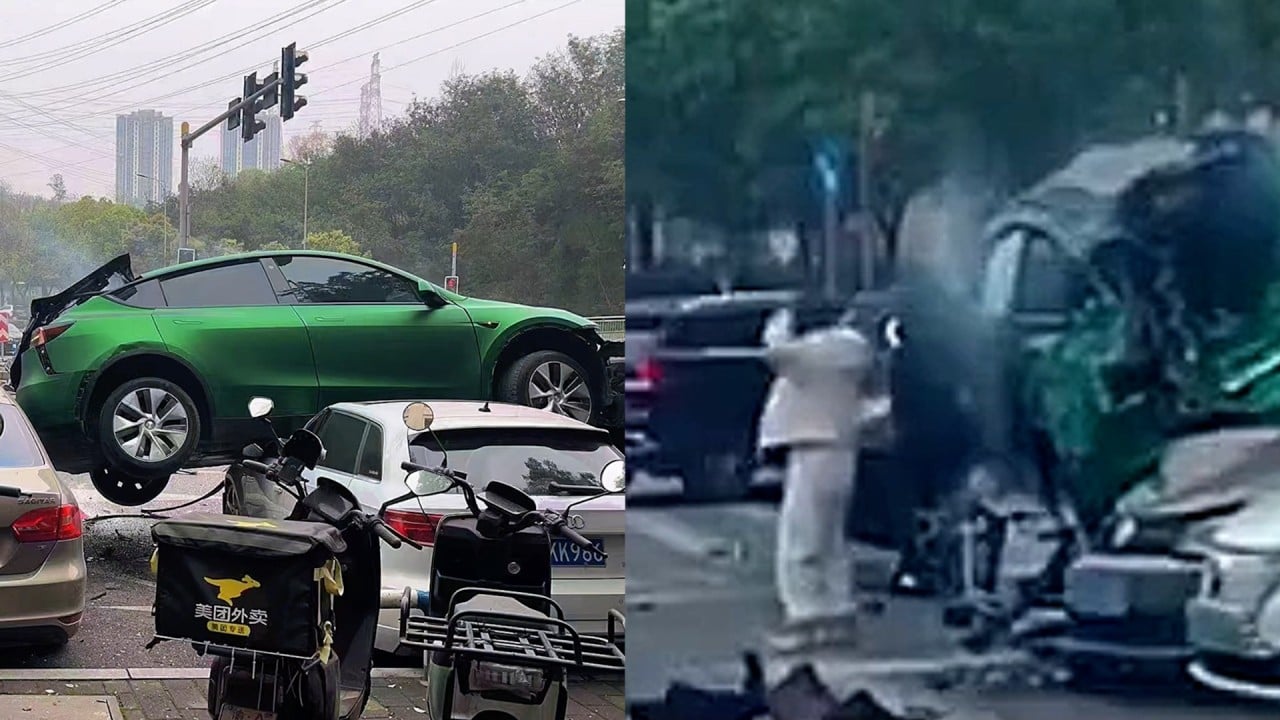 中国女司机经历特斯拉飞车事故后幸存,车辆坠落在停放汽车上
