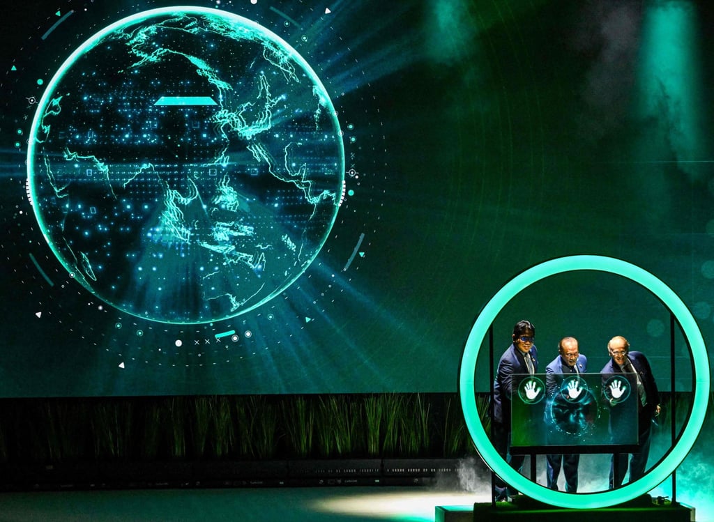(从左至右)马来西亚国家石油公司首席执行官东姑穆罕默德·陶菲克、总理安瓦尔·易卜拉欣与标普全球副主席丹尼尔·耶金周一在吉隆坡共同启动亚洲能源会议。摄:法新社