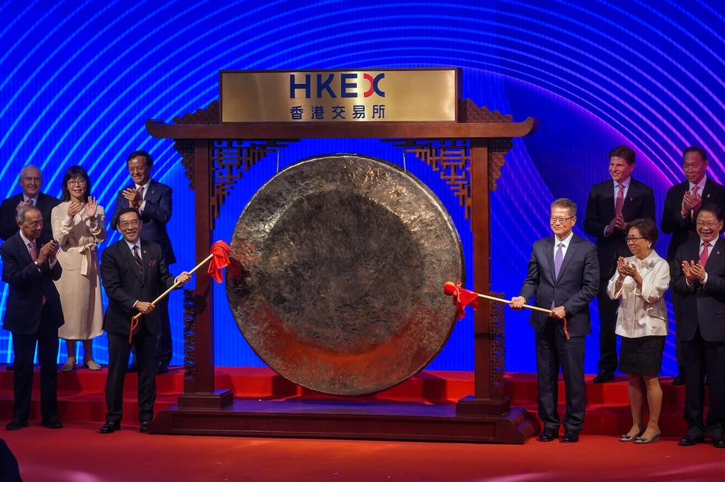 港交所主席史美伦(左)与财政司司长陈茂波周五共同敲锣,正式启动交易所25周年庆祝活动。摄影:Elson Li