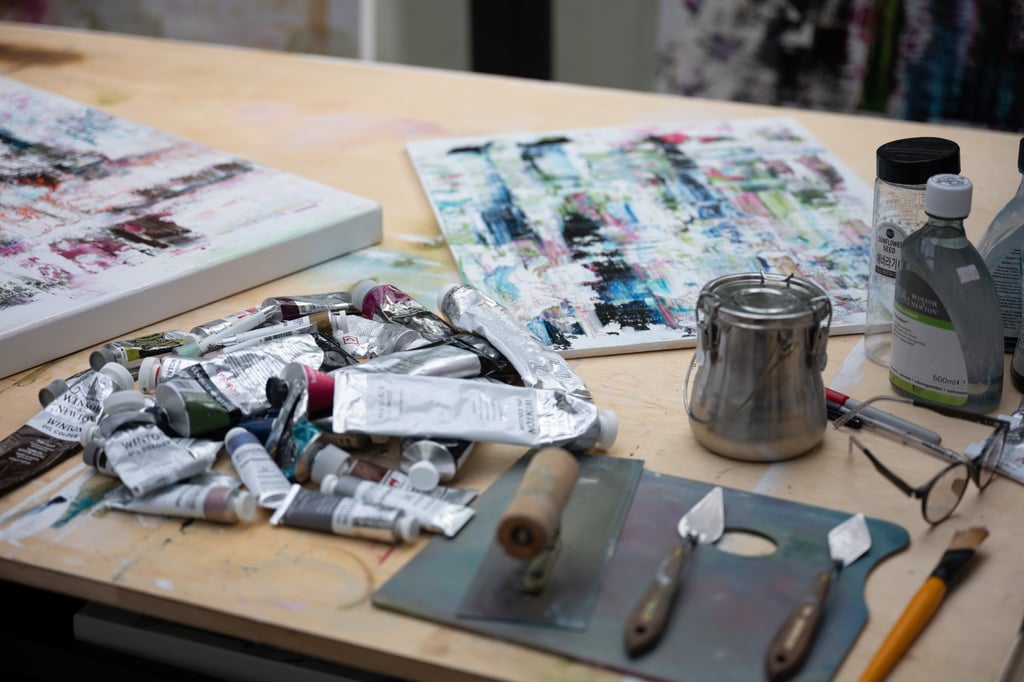 香港大屿山东海岸梅窝,杰西卡·祖布工作室画廊兼工作间里摆放着颜料和工具的作业台。摄影:尤金·陈