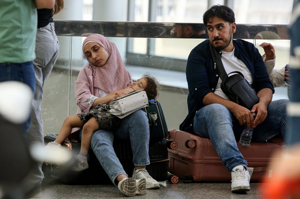 6月13日,受以伊冲突影响,滞留旅客在黎巴嫩某机场候机厅等待。图片来源:德新社