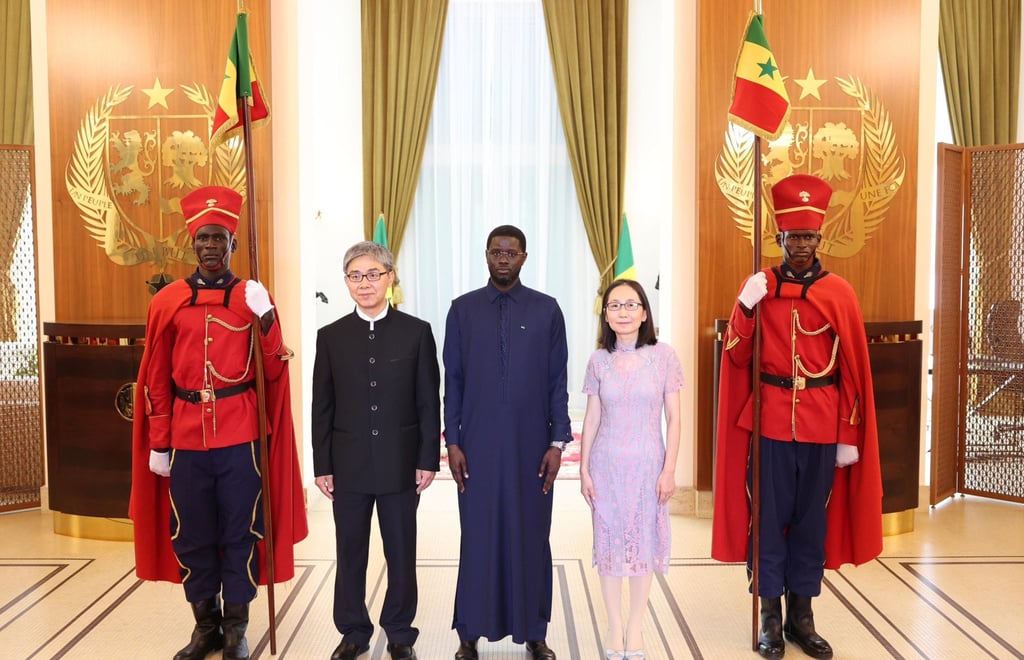 2024年5月,中国驻塞内加尔大使李志刚(左)向塞内加尔共和国总统迪奥马耶·法耶递交国书。图片来源:官方供图