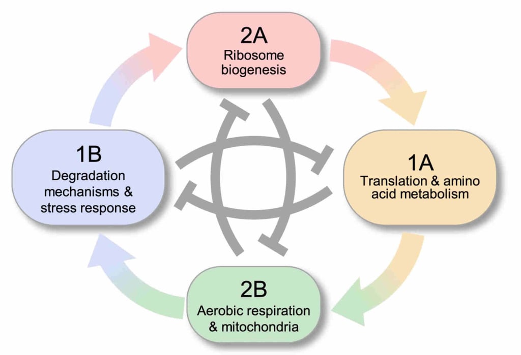虽然长期以来酵母代谢被研究为一个三阶段过程,但李的团队选择使用数学工具将其重组为四个不同但相互关联的阶段。