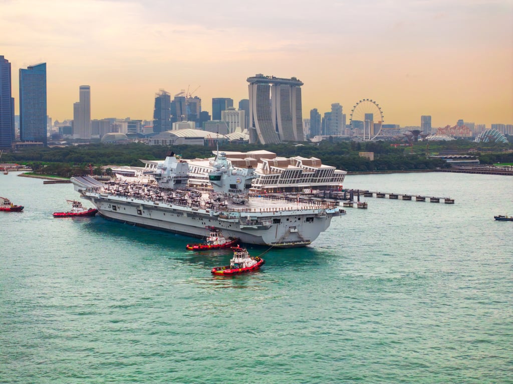 英国航母打击群在访问期间选择停靠新加坡民用游轮中心而非海军基地的决定,凸显了在中东冲突背景下,伦敦对该地区软实力和公众影响力的重视。以新加坡标志性天际线为背景,长284米、排水量8万吨的"威尔士亲王"号航母于周一成为首艘停靠滨海湾游轮中心的军舰,这是其为期八个月的"高桅行动"部署中的首个停靠港。