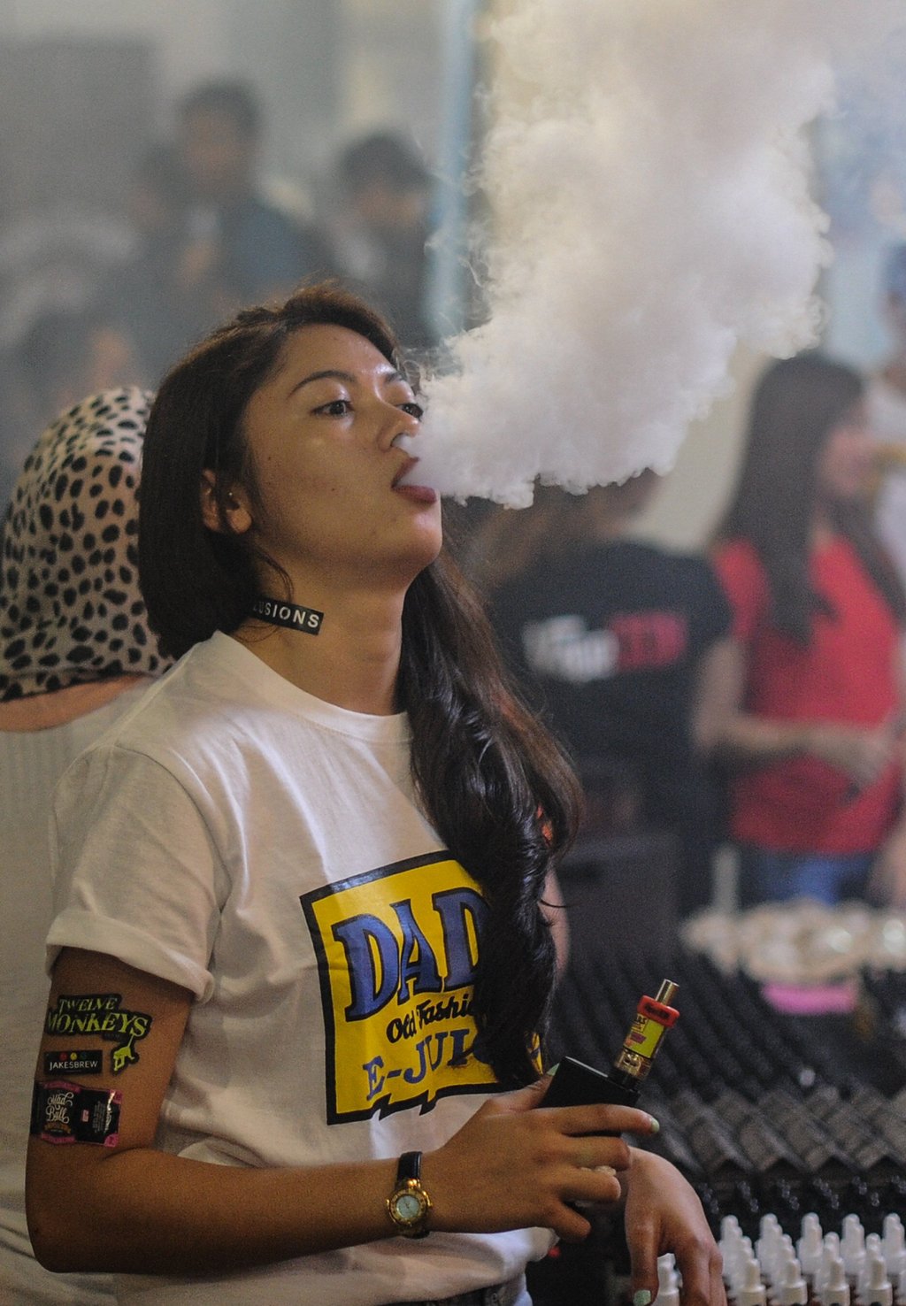 2015年,一名推广员在吉隆坡的一次电子烟博览会上吸电子烟。照片:法新社