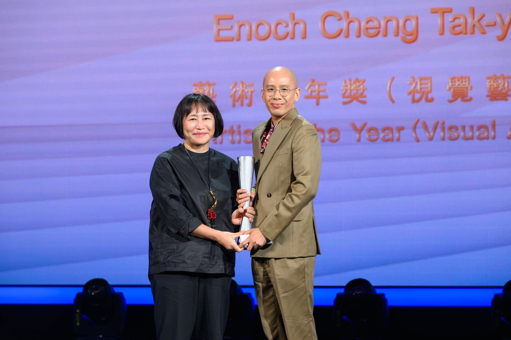 郑得恩(右)在香港大会堂举行的2025年香港艺术发展局颁奖典礼上,从文化遗产、艺术与纺织中心执行董事高桥美月手中接过年度艺术家(视觉艺术)奖。照片:香港艺术发展局