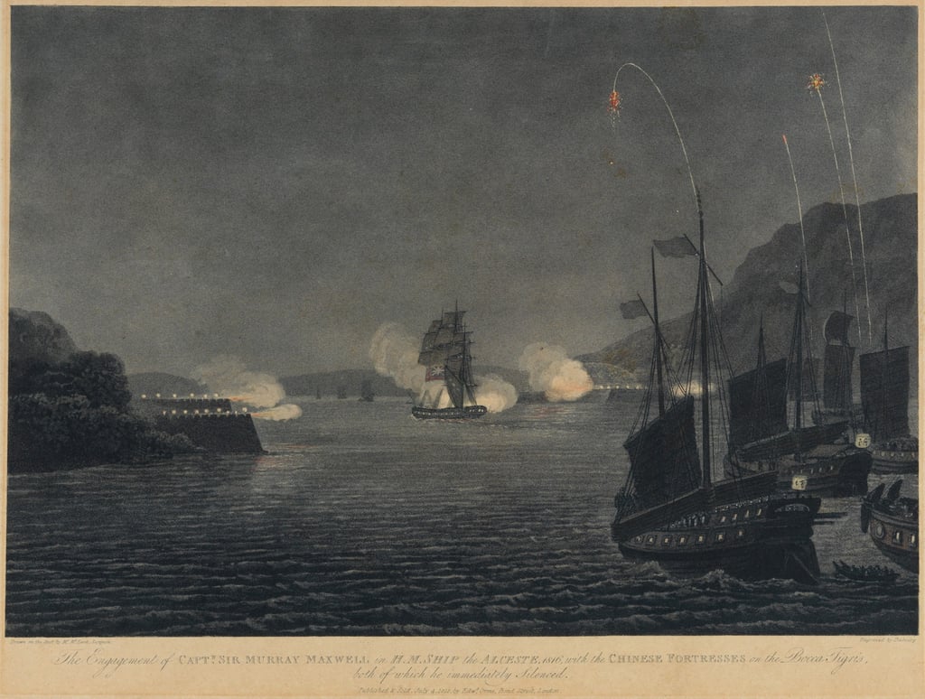 约翰·麦克劳德绘制的《1816年阿尔刻斯提号与虎门炮台交战图。香港艺术馆藏,保罗·遮打爵士捐赠。“寻珍记:遮打藏品的守护者"特展展品。图片来源:主办方提供