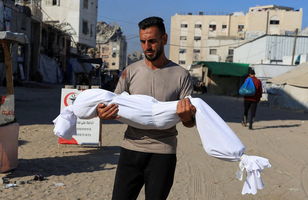 一名男子抱着儿童的遗体。加沙境内巴勒斯坦死亡人数已超过5.6万。照片:路透社
