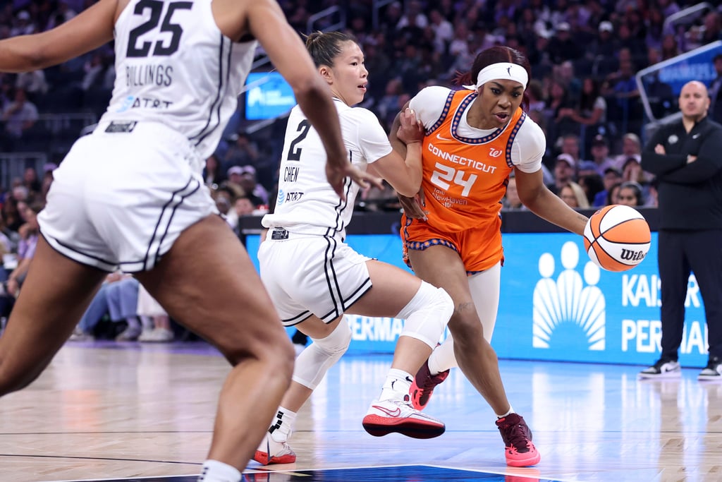 6月22日旧金山WNBA比赛中,凯特琳·陈防守康涅狄格太阳队球员阿妮萨·莫罗。图片来源:美联社 via《旧金山纪事报》