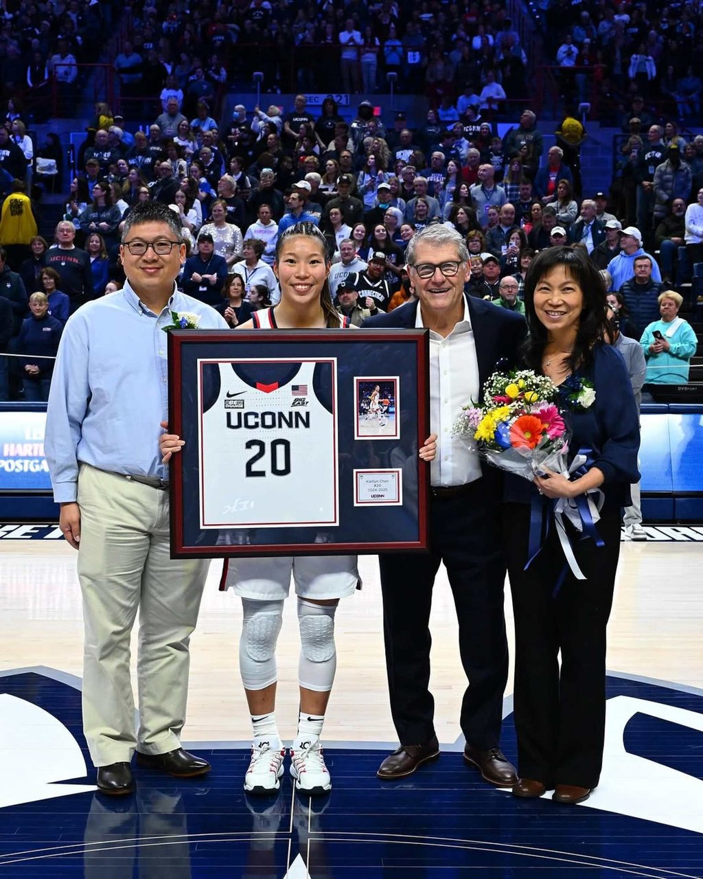 NCAA女篮赛后,陈凯琳在毕业日庆祝活动中身着康涅狄格大学球衣与父母合影。图片来源:@kaitlyn.chen/Instagram