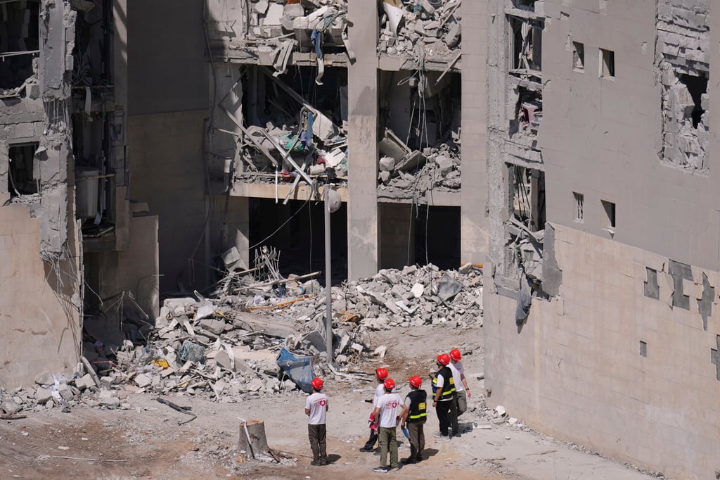 周三,在以色列贝尔谢巴,停火协议宣布后,伊朗发射的导弹直接击中一栋居民楼的第二天,以色列官方调查人员和志愿者正在检查受损建筑。美联社照片