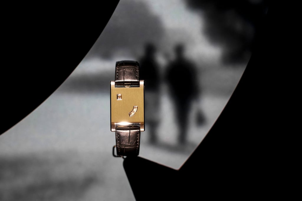 4月1日"钟表与奇迹"展会首日,卡地亚展台展示的Tank à Guichet跳时腕表。摄影:法新社