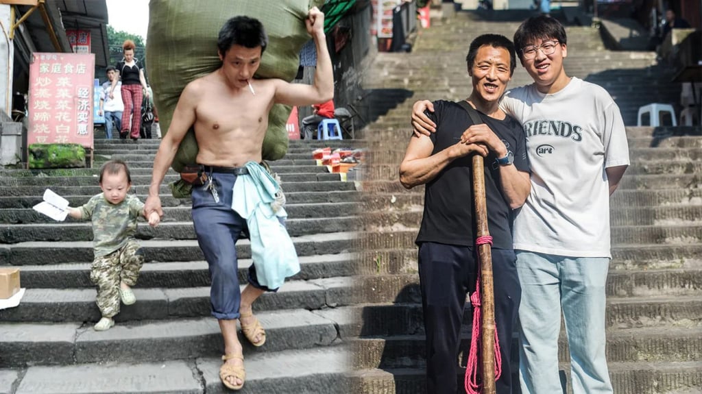 一位勤劳的中国男子和他的儿子因15年前男孩还是蹒跚学步时拍摄的照片走红,如今因父亲节致敬再次成为焦点。照片:南华早报合成/澎湃新闻/央视
