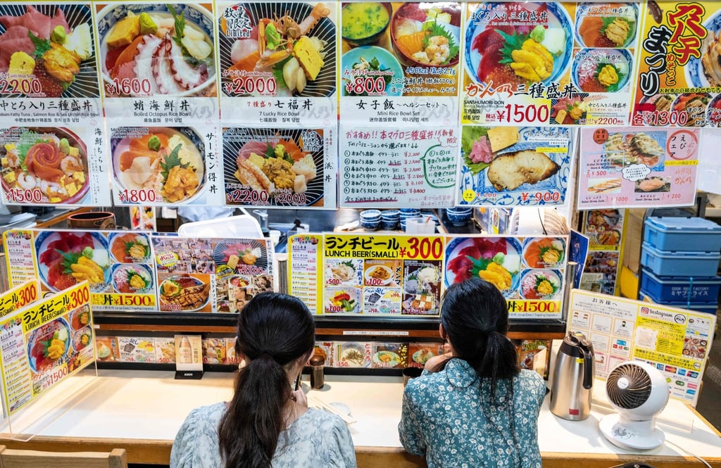 两名女性在筑地鱼市场众多小型海鲜餐厅中的一家等待早餐。照片:法新社