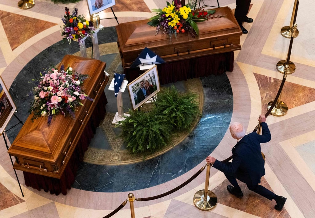周四,美国前总统乔·拜登向停灵于州议会大厦圆形大厅的梅丽莎·霍特曼、其丈夫马克·霍特曼及他们的爱犬吉尔伯特致哀。图片来源:盖蒂图片社/法新社