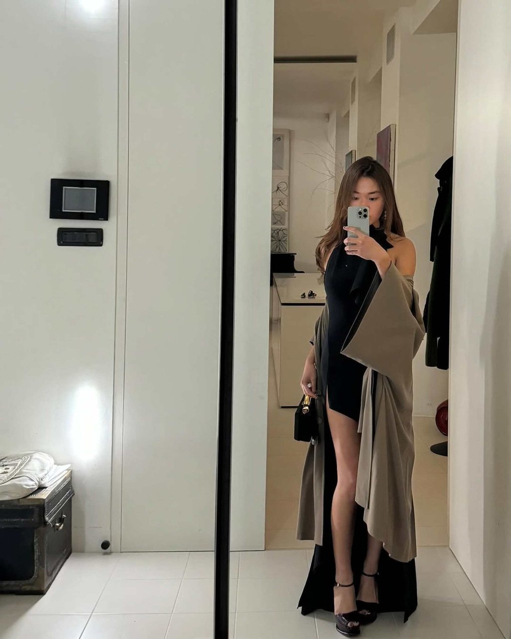 克洛伊·李近期Instagram照片,身着小黑裙搭配 oversized 灰色外套与黑色手袋。照片来源:@cachetdechloe/Instagram