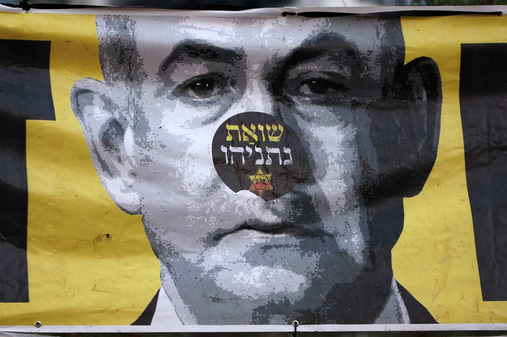 周六,在特拉维夫举行的一场反政府抗议活动中,一条横幅上描绘了以色列总理,上方贴着一张用希伯来语写着“内塔尼亚胡的大屠杀”的贴纸。照片:法新社