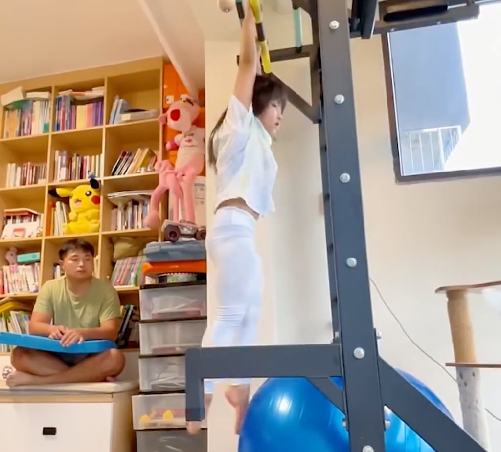 她在家里灵活完成高难度训练任务的视频展示了其腹部和腿部练就的肌肉力量,这些视频在社交媒体上疯传。