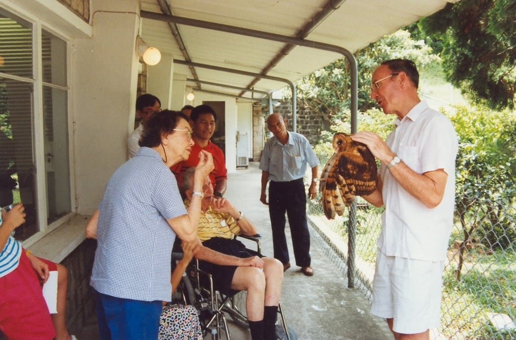 加里·阿德斯的父亲吉姆·阿德斯(右)1993年在香港石岗办公室外,手持草鸮与兰花专家葛洛丽亚·巴雷托(左)及贺理士·嘉道理爵士(坐轮椅者)交谈。照片由加里·阿德斯提供