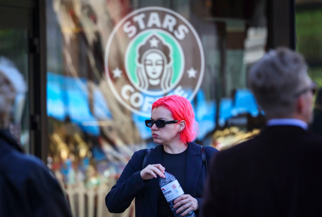 一名女子走过俄罗斯连锁品牌"星星咖啡",该品牌在原星巴克门店旧址经营。图片来源:EPA