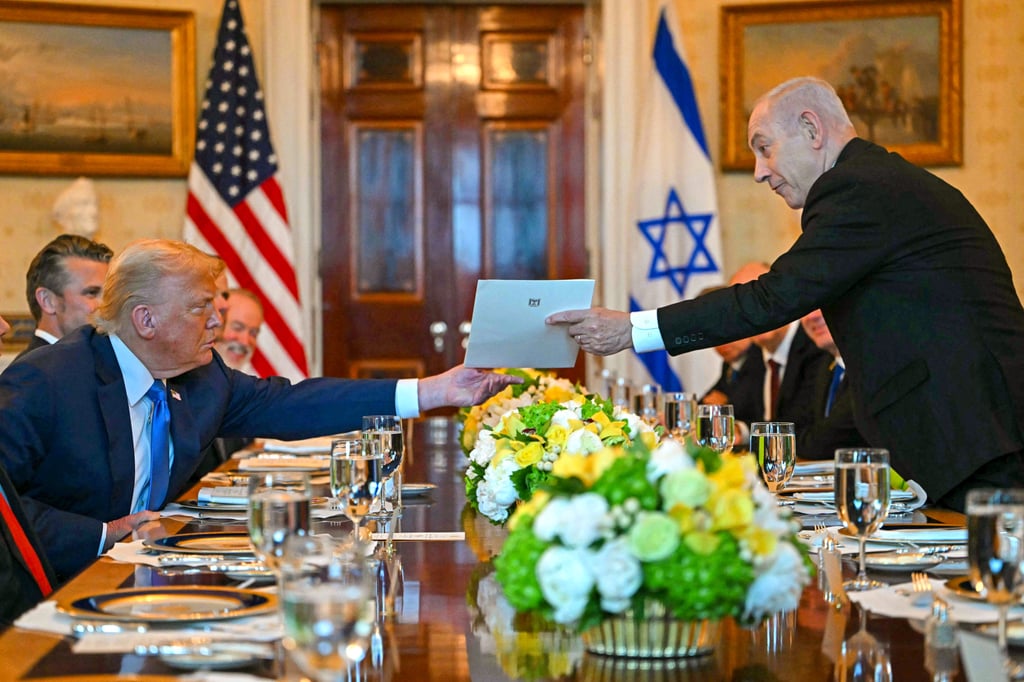 以色列总理内塔尼亚胡(右)周一在白宫向美国总统特朗普递交信函。图:法新社