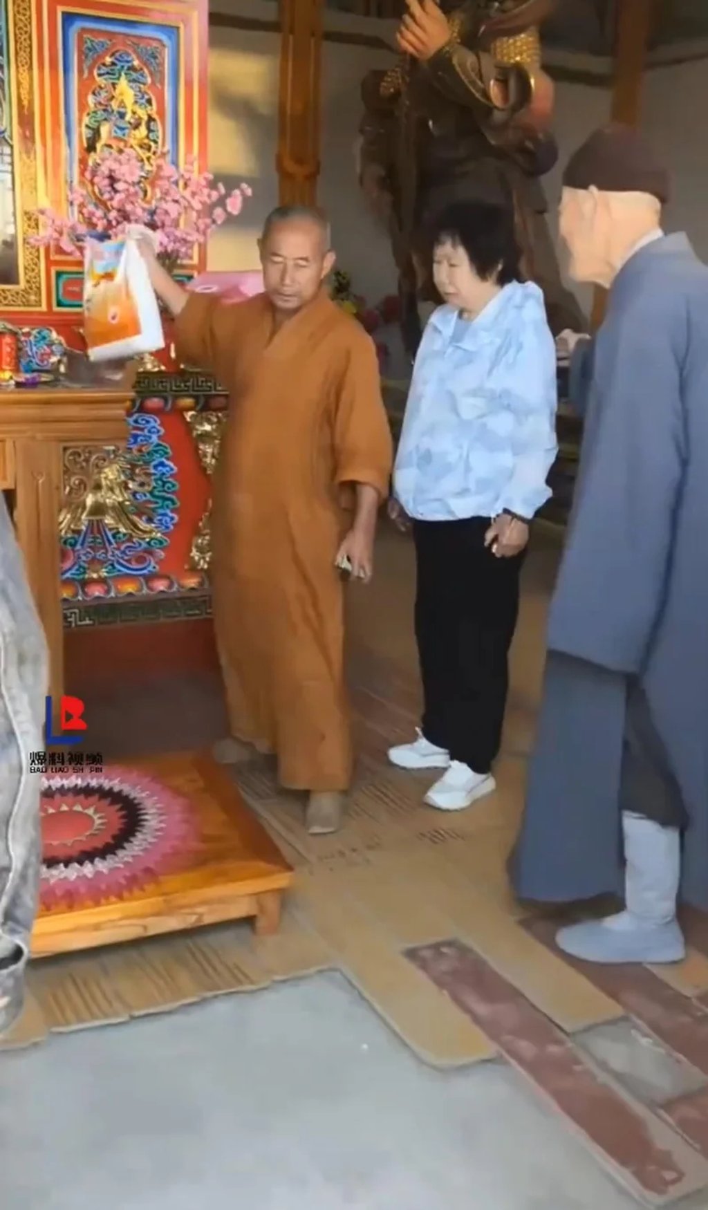 僧人举起老夫妇的米袋,称其供奉"不诚心"。图源:抖音