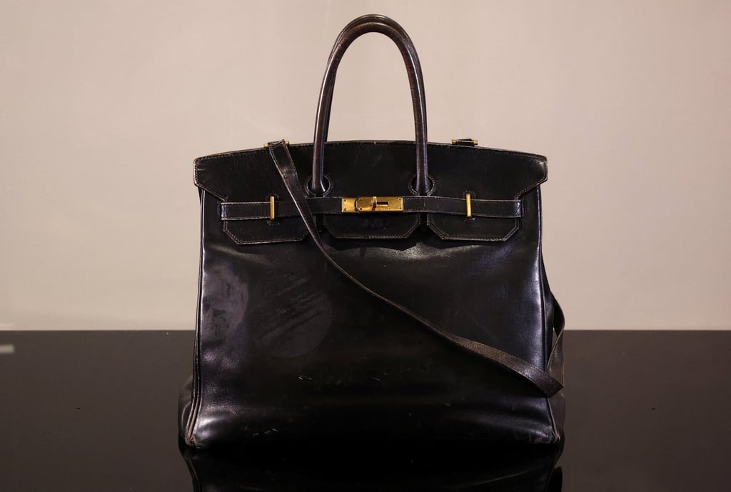这款原始柏金包是爱马仕1985年为女星简·柏金设计并赠予她的珍品,图为7月2日巴黎苏富比时尚偶像拍卖会预展现场。照片:路透社