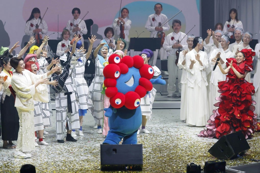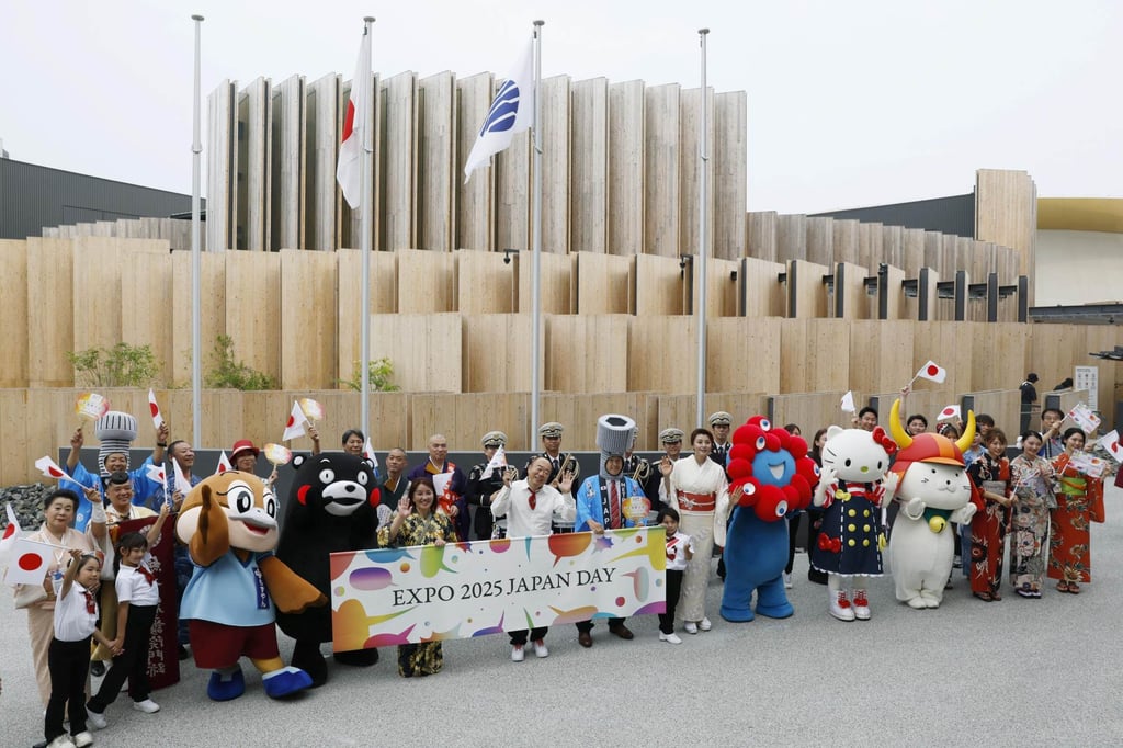 7月3日,世博会吉祥物与工作人员在日本馆前合影。图:共同社
