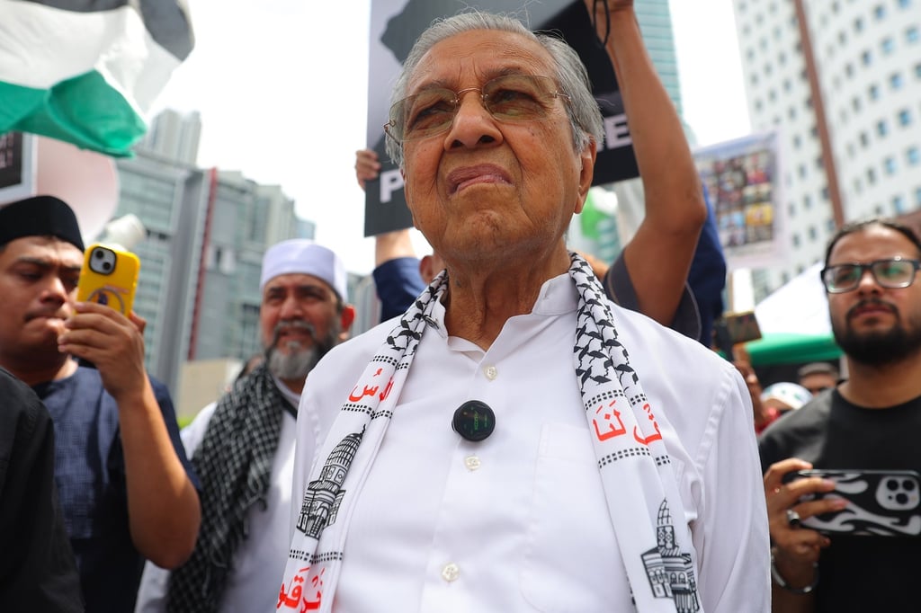 3月28日,马来西亚前总理马哈蒂尔(中)在吉隆坡参加声援巴勒斯坦人民的集会。图片来源:EPA