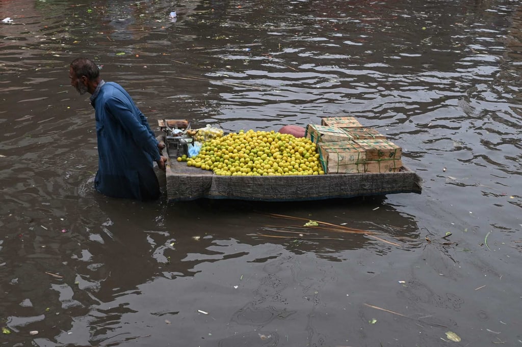 7月16日,拉合尔街头商贩在积水中艰难推车前行。图片来源:法新社