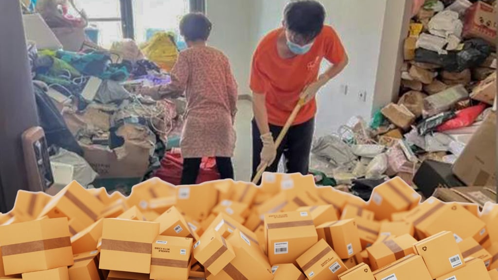 中国一位老妇人因网购成瘾消费28万美元,家中未拆快递堆积至天花板。图片来源:南华早报合成图/Shutterstock/抖音