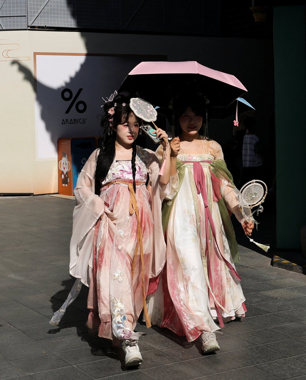 7月4日,上海街头身着传统服饰的女性撑伞遮阳。路透社摄