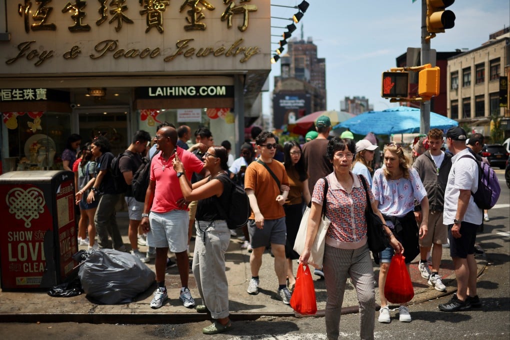警方称,周六上午一辆被盗的失控租赁汽车冲上纽约唐人街熙攘的行人安全岛,造成两人死亡。