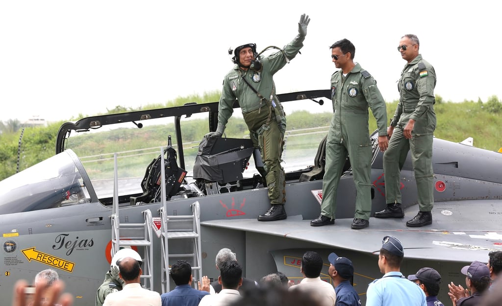 2019年,印度国防部长拉杰纳特·辛格在班加罗尔驾驶光辉轻型战斗机后挥手示意。照片:EPA-EFE