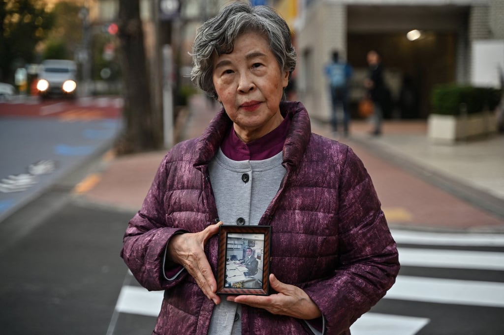 1995年沙林毒气事件中丧生的高桥和正之妻佐佐木静枝,今年二月在东京地铁站外手持丈夫遗照。摄:法新社