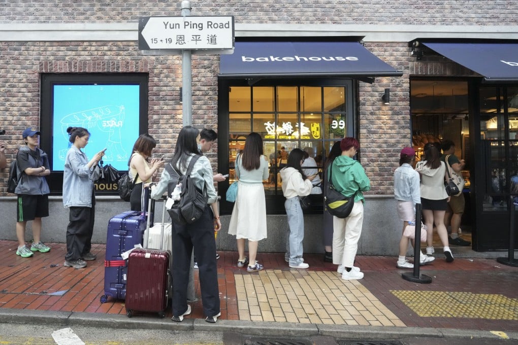 香港一个寻常工作日,台风逼近之际,铜锣湾Bakehouse分店外顾客冒雨排队,等待进入这家以酸种蛋挞、手工面包和新鲜糕点风靡社交媒体的烘焙店。