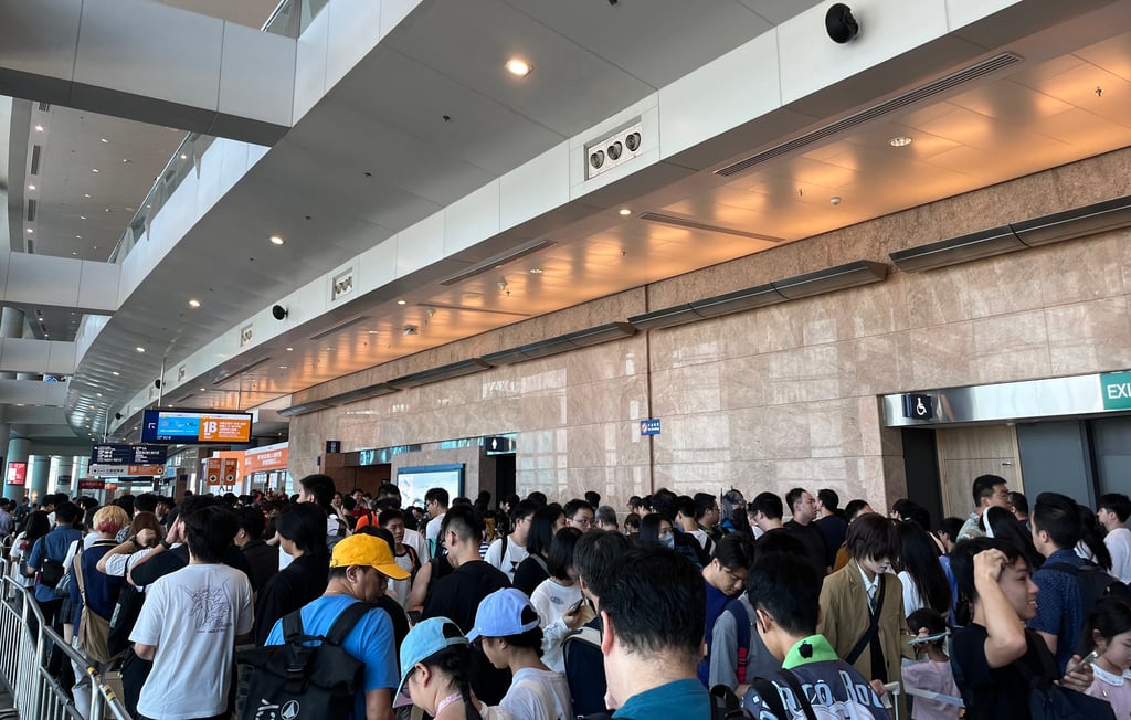 周六下午2点半,排队人潮从会展中心蜿蜒至街对面人行天桥,延伸至中环广场,队伍持续移动未见尽头。