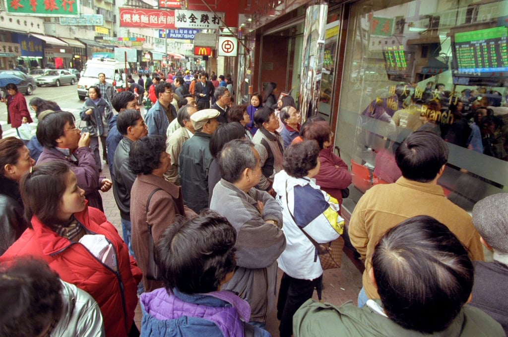 2000年3月1日,互联网泡沫巅峰时期,投资者聚集在香港一家本地银行外,查看tom.com首日交易的最新股价。照片:南华早报图片