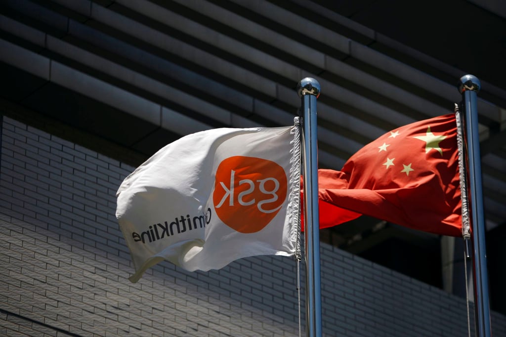 2013年7月12日,上海葛兰素史克(GSK)办公楼外,公司旗帜与中国国旗并列。图片来源:路透社